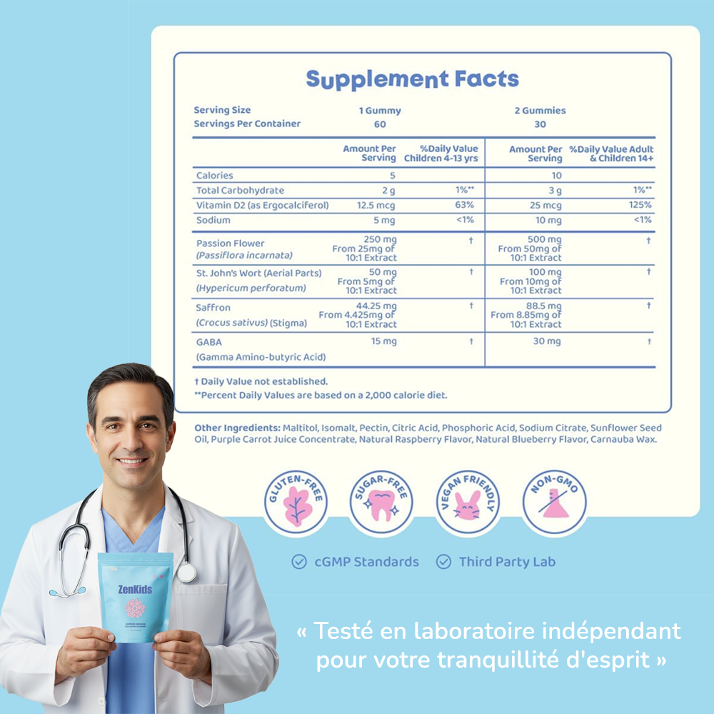 Oui, absolument. Nos gummies au safran sont fabriqués avec des dosages étudiés cliniquement spécifiquement sûrs pour les enfants de 4 à 12 ans. Le safran est utilisé en toute sécurité depuis des siècles, et notre formule contient les mêmes quantités démontrées efficaces dans les études de recherche pédiatriques. Chaque gummy est testé par un laboratoire tiers pour la pureté et ne contient aucun stimulant artificiel ou produit chimique agressif.
